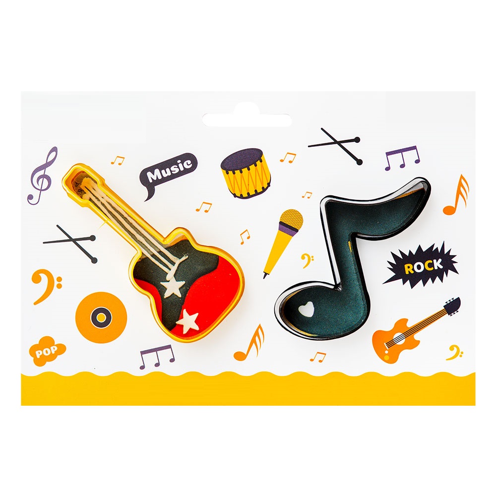 Home Cortadores Conj. 2 Cortadores Música Conj. 2 Cortadores Música 3,90 € Desconto de %. IVA incluído. Comprar Contactar Adicionar à wishlist Tamanho : Nota Musical 6 x 7 x 2,2 h cm – Guitarra 4 x 9 x 2,2 h cm Conjunto de 2 cortadores de massa em plástico; perfeito para fazer biscoitos e formas de doces, salgados, chocolate e massa de modelar.