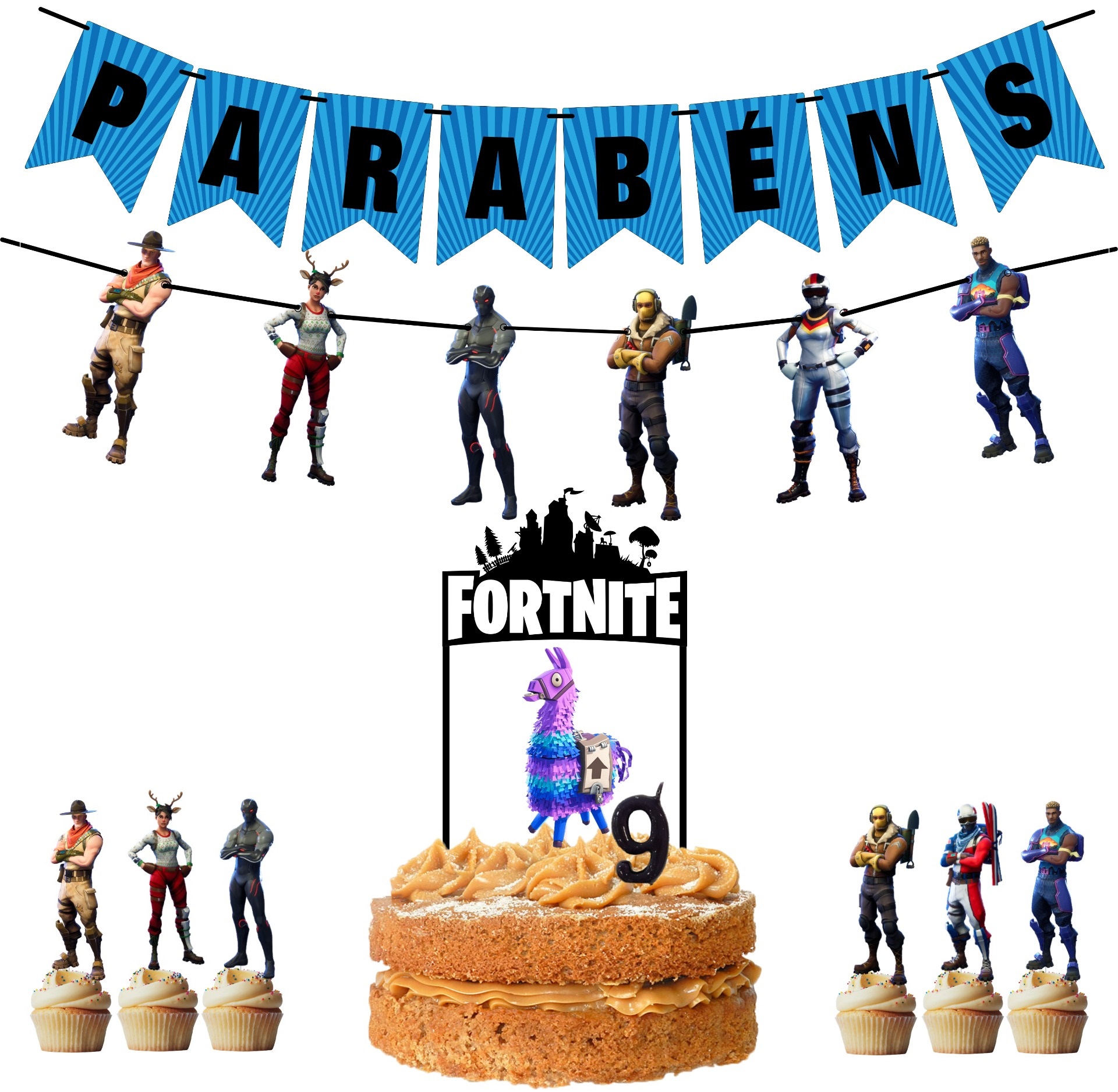 Home Festa Fortnite Kit Festa Fortnite Kit Festa Fortnite 24,90 € Desconto de %. IVA incluído. Comprar Contactar Adicionar à wishlist Kit composto por: - Bandeirolas Parabéns; - Grinalda com figuras do tema; - Topo de bolo do tema (bandeira com palhinhas de papel e figura impressa em papel laminado com palito de plástico transparente); - Conj. 6 toppers do tema (figuras impressas em papel laminado com palitos de plástico transparente); - Vela (Atenção: Deverá indicar a idade no final da encomenda, no campo "observações").