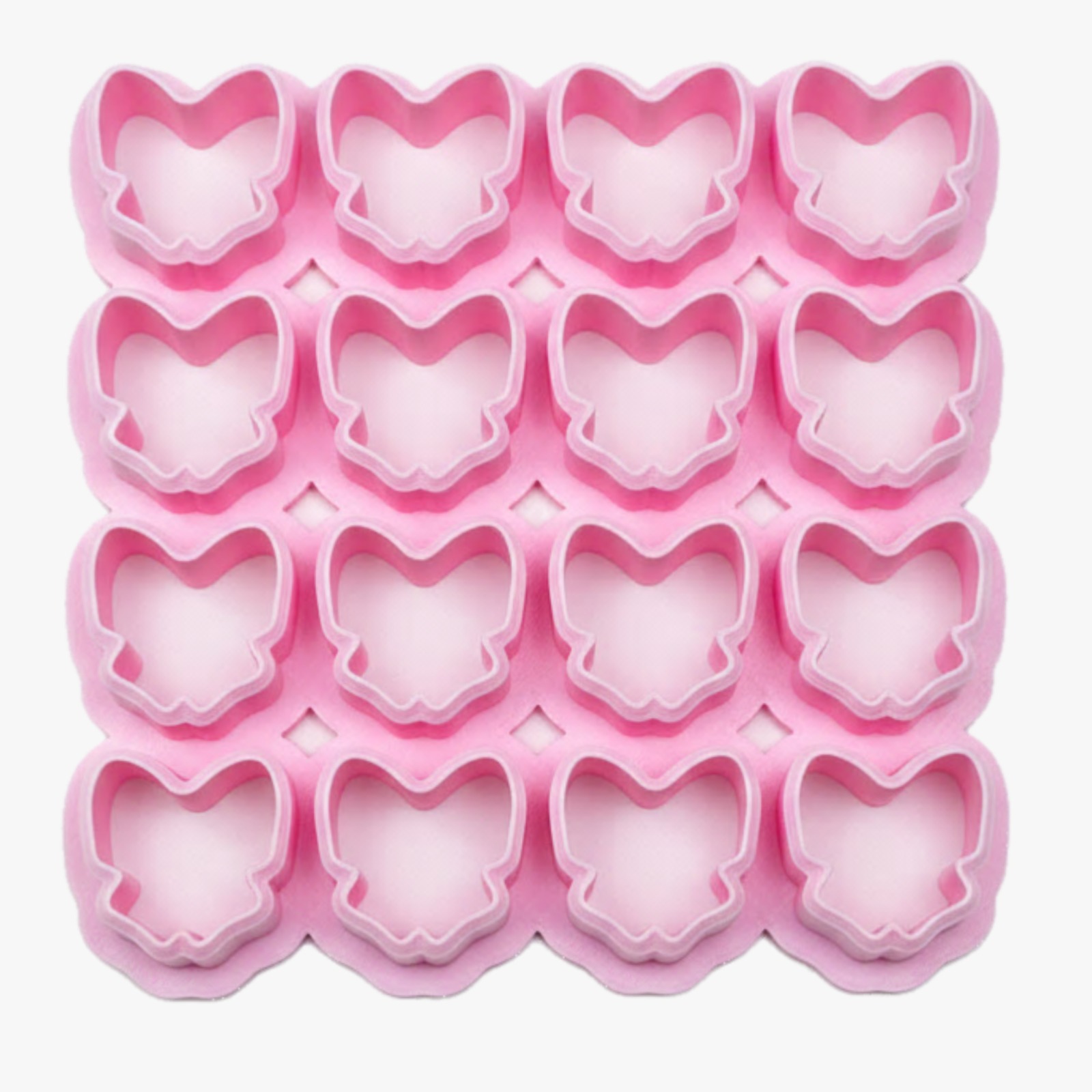 Modelo: Laços Medida individual do laço: 1,5 cm Quantidade de cortes por utilização: 16 unidades Dimensões totais do multi-cortador: 78 × 79 mm Altura: 15 mm Material: PLA (bioplástico de origem vegetal) Método de fabrico: Impressão 3D Cor: Aleatória