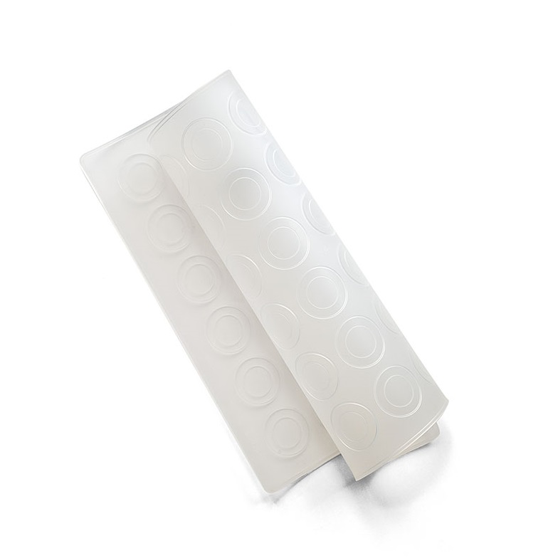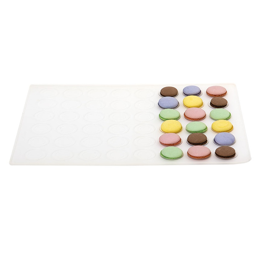 Fabricado em 100% Silicone Platina *. Resiste perfeitamente ao congelamento e ao cozimento. Não altera o sabor dos alimentos. Antiaderente e transparente com 48 cavidades para fazer 24 macarons acoplados de cm ø 2 ou 3,5. Lavável e reutilizável. Seguro para micro-ondas e resistente até -40 ° C + 230 ° C.
